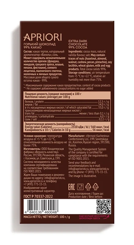 Экстра горький шоколад без сахара. Яркий, насыщенный вкус какао бобов с легким оттенком ванили. Шоколад создан по собственной уникальной рецептуре. Это российский шоколад высокого качества. Чистый состав, без эквивалентов какао-масла.