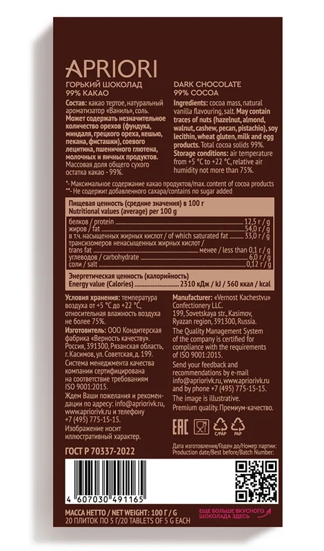 Шоколад Априори горький какао 99% (5г x 20шт), 100г