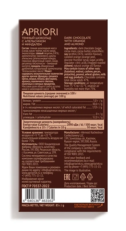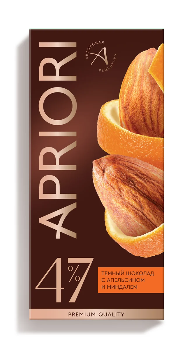 Шоколад Априори темный с апельсином и миндалем 47%, 85г