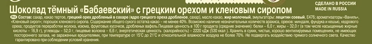 Шоколад Бабаевский темный с грецким орехом и кленовым сиропом 51.5%,75г