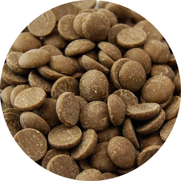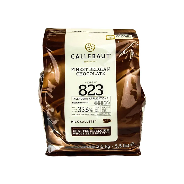 Шоколад рецептуры 823NV – это настоящий шоколад бельгийского производства, характеризующийся высоким качеством и превосходным вкусом. В нем отлично сбалансированы такие ингредиенты как молоко, какао и карамель. Шоколад выпускается в специально разработанной для быстрой плавки капельках – каллетах. Это небольшие шоколадные монетки, которые, благодаря своему размеру, быстро нагреваются (чего нельзя сказать о пли??ках или блоках) и превращаются в жидкое состояние. Кроме того, каллеты удобно дозировать. Шоколад может быть использован как для глазировки конфет и других кондитерских изделий, так и для отлива фигурок и конфет.
