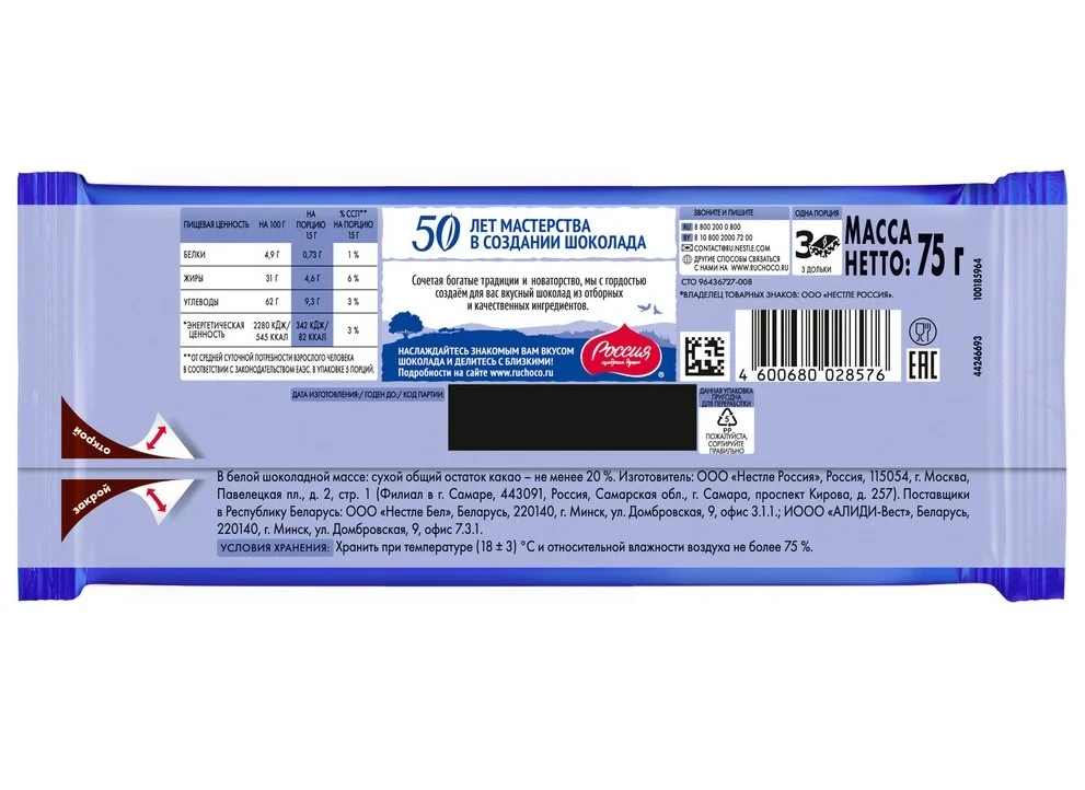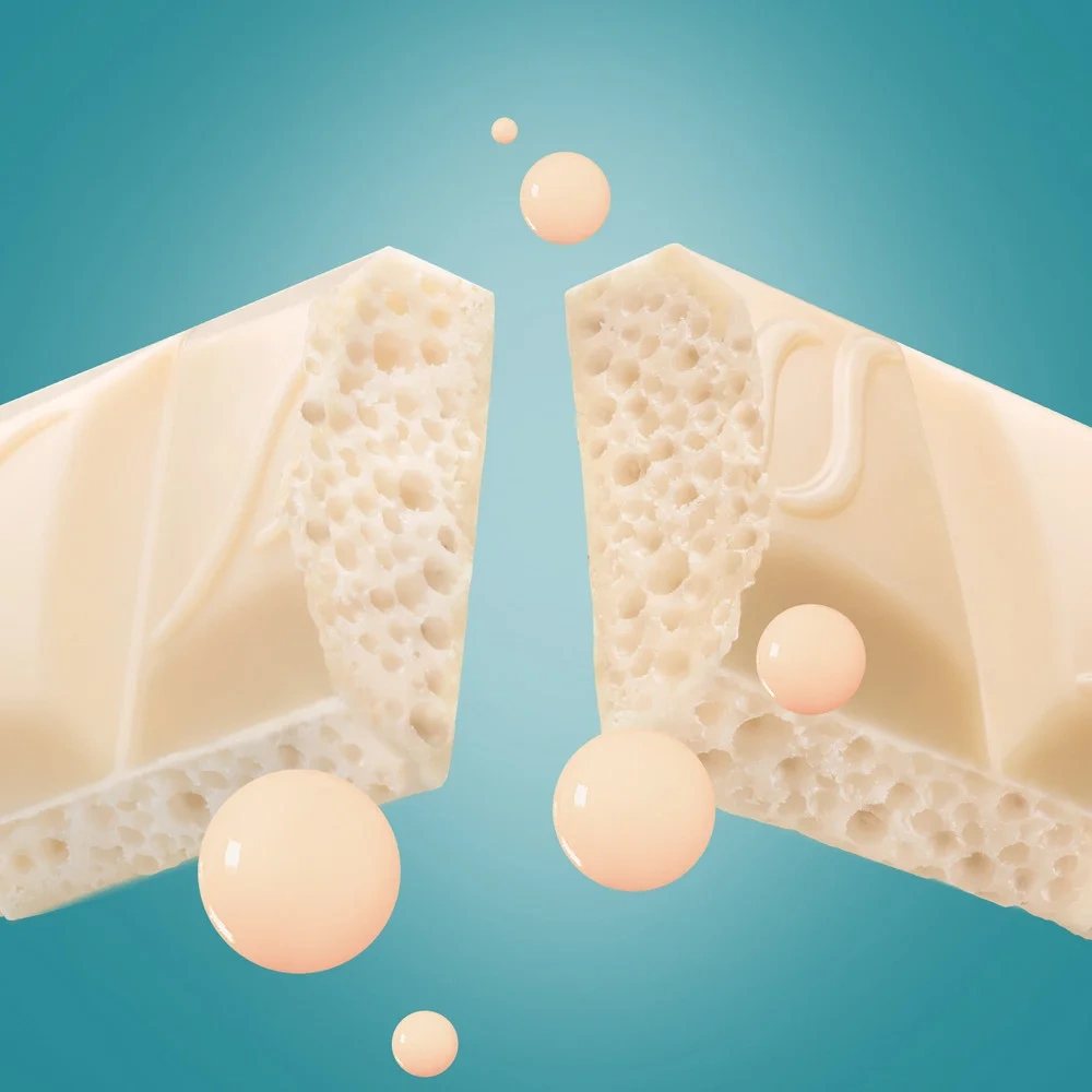 Изящная обновленная форма дольки шоколада раскрывает весь яркий и насыщенный молочный вкус. Воздушные пузырьки в шоколаде медленно таят во рту, а сочетание нежного белого и молочного шоколада доставляют особое удовольствие. Белый пористый шоколад непременно порадует сладкоежек всех возрастов и станет идеальным дополнением любого чаепития.