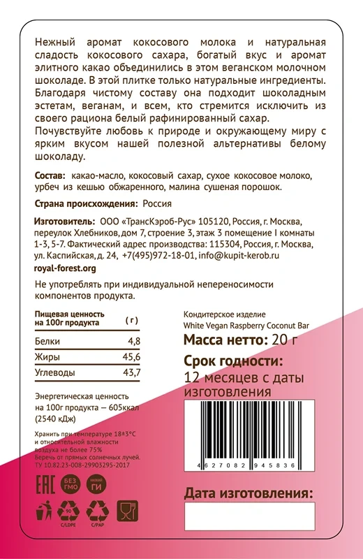 Нежная сливочная текстура кокосового молока и урбеча из кешью, натуральная сладость кокосового сахара, богатый аромат элитного какао-масла и яркая оттеняющая кислинка малины подарят наслаждение от каждого кусочка. Здоровая альтернатива шоколаду для сбалансированного правильного питания.