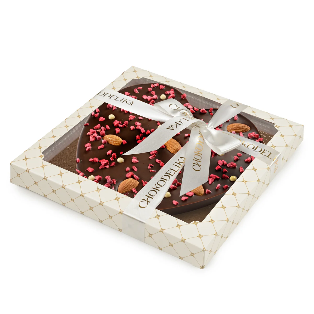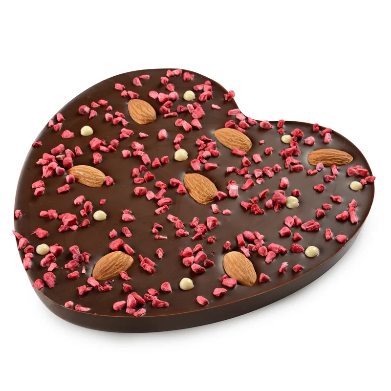 Шоколад Малиновое сердце с миндалём изготовлен из высококачественных ингредиентов, которые придают ему неповторимый вкус и аромат. Тёмный бельгийский шоколад имеет глубокий и насыщенный вкус, который прекрасно сочетается с хрустящим миндалём и нежными кусочками сублимированной малины. Шоколад Малиновое сердце - отличный способ выразить свои чувства и порадовать близких людей. Истинное удовольствие для тех, кто ценит изысканные вкусы. Он сочетает в себе насыщенность темного шоколада с хрустящими ядрами отборного миндаля и нежным ароматом сублимированных ягод малины. Малиновое сердце станет прекрасным дополнением к любому подарку, будь то День святого Валентина, 8 Марта или просто приятный сюрприз для любимого человека. Это не просто шоколад, это символ любви и заботы, который обязательно порадует ваших близких.