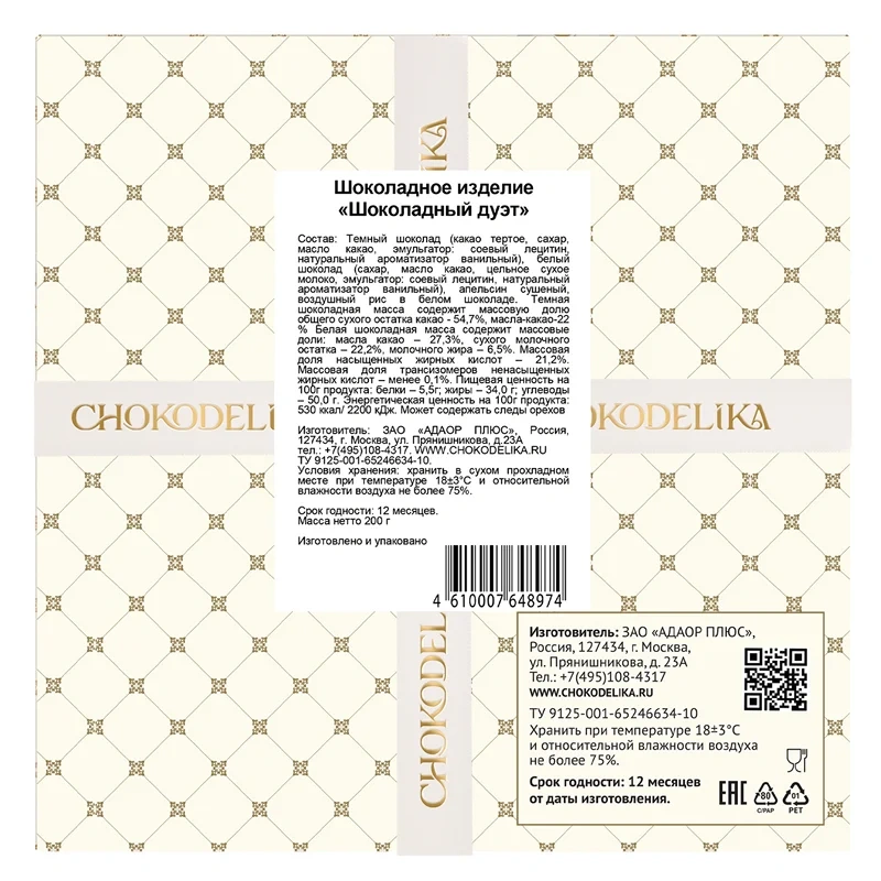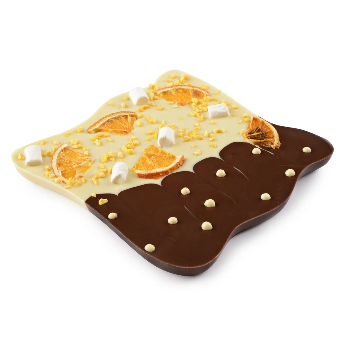 Шоколадный дуэт - это гармония неповторимых вкусов тёмного и белого шоколада. Десерт украшен апельсиновыми цукатами, маршмеллоу и воздушным рисом, что делает его идеальным выбором для любого случая. Это идеальный подарок для близких и друзей, а также прекрасный способ порадовать себя без всякого повода.
