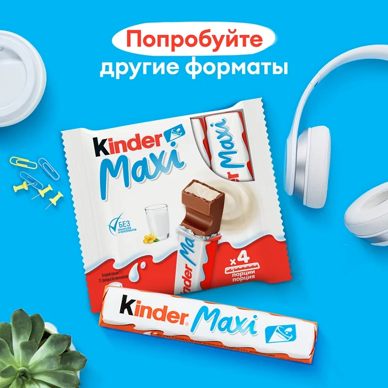 Kinder Chocolate Maxi (Киндер Шоколад Макси)- превосходный молочный шоколад, созданный специально для детей. Kinder Chocolate Maxi уже давно любят и дети, и их родители. Теперь этот продукт представлен в новом удобном формате: в каждой его порции еще больше шоколада и молочной начинки. Kinder Chocolate Maxi - Ваш малыш вырос!