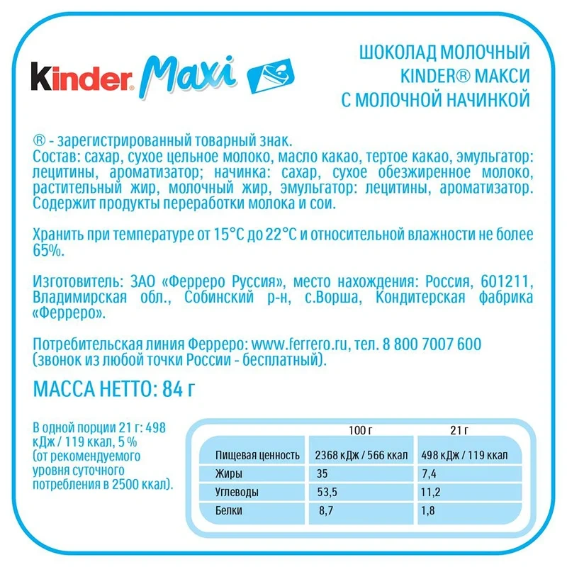 Kinder Chocolate Maxi (Киндер Шоколад Макси)- превосходный молочный шоколад, созданный специально для детей. Kinder Chocolate Maxi уже давно любят и дети, и их родители. Теперь этот продукт представлен в новом удобном формате: в каждой его порции еще больше шоколада и молочной начинки. Kinder Chocolate Maxi - Ваш малыш вырос!