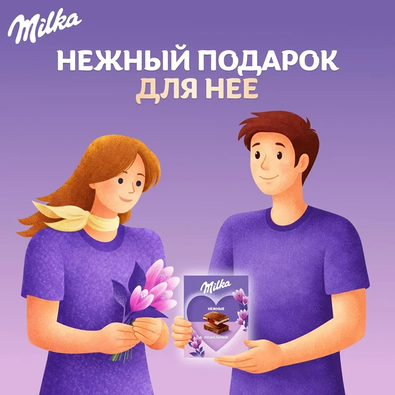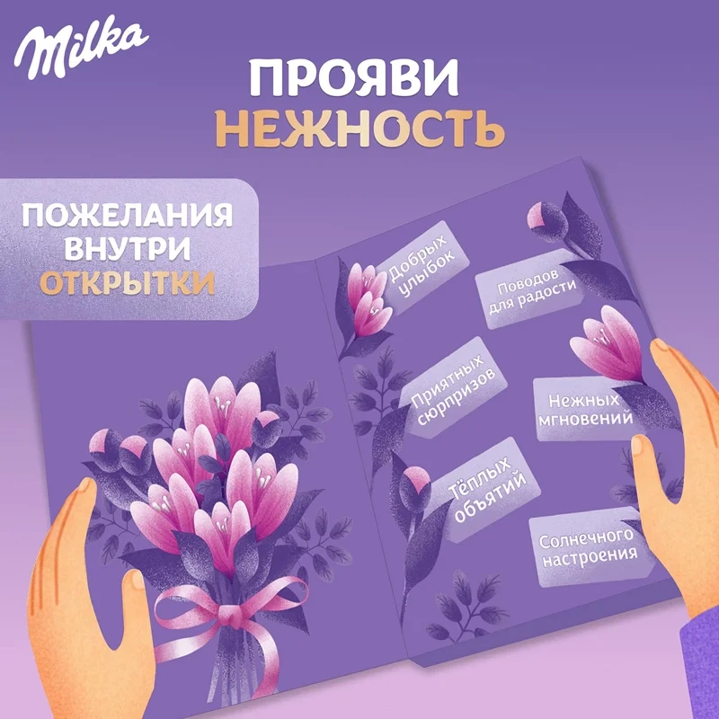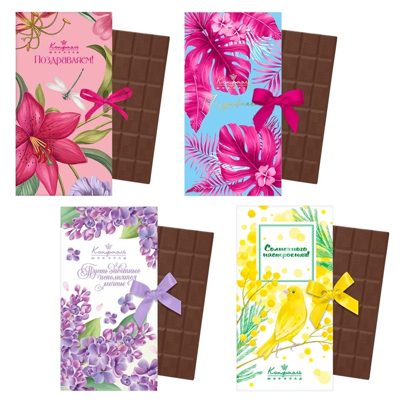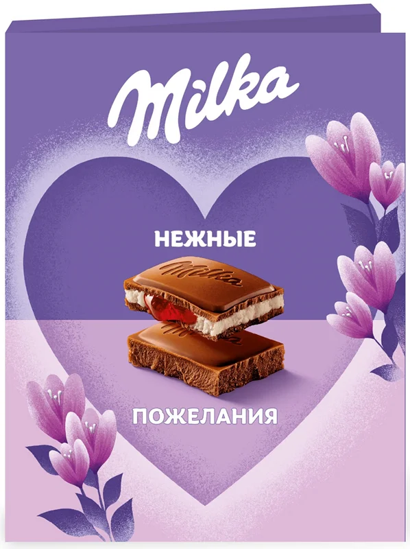 При одном лишь взгляде на эту красивую открытку с пожеланием сразу поднимается настроение. Бумажная открытка украшена авторским оформлением и содержит внутри молочный шоколад, который славится своим нежнейшим вкусом.