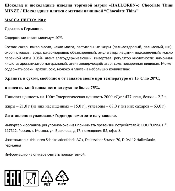 Сахар, масло какао, молоко цельное сухое, какао тертое, какао-порошок, сыворотка молочная сухая, молочный жир, паста ореховая из ядер фундука, эмульгаторы соевый лецитин, Е476, соль, ароматизаторы.