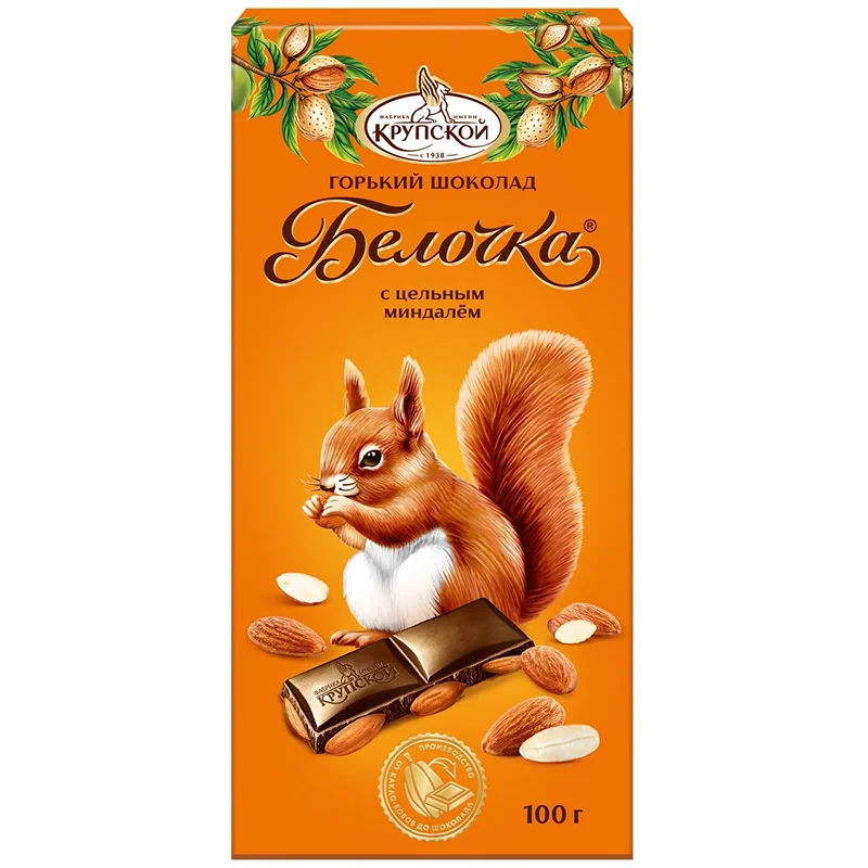 Шоколад Крупской Белочка горький, с цельным миндалем, 100г