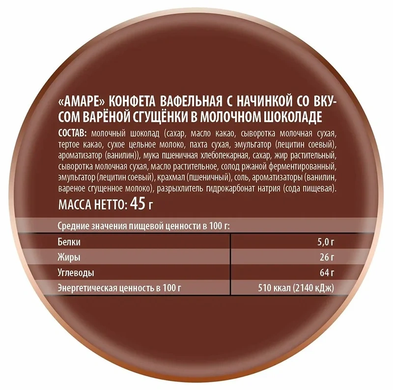Сахар, какао-паста, какао-масло, цукаты из апельсиновых корок (апельсиновые корки, глюкозно-фруктозный сироп, сахар, декстроза, концентрированный лимонный сок), эмульгатор - соевый лецитин, натуральный ароматизатор - апельсин, ваниль.
