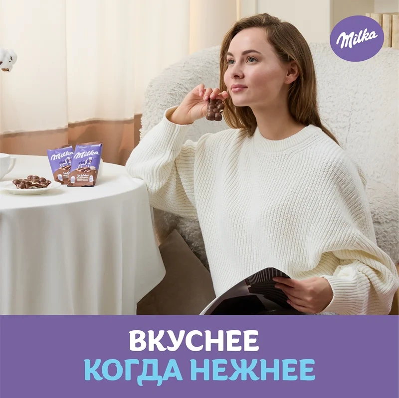 Milka Bubbles — это нежный пористый шоколад с изысканной начинкой со вкусом капучино. Шоколад молочный изготовлен из какао высокого качества в и содержит альпийское молоко, поэтому он тает во рту и заставляет сердце трепетать от нежности! В каждом кусочке Milka Bubbles заключены тысячи воздушных пузырьков, которые раскрывают всю нежность молочного шоколада. Фирменный вкус шоколада Milka дополняет начинка капучино с ярким вкусом и сливочно-кофейным ароматом. Шоколад пористый добавит нежности в ваши будни: начните утро с кусочка Milka Bubbles, возьмите шоколадку с собой на перекус или оставьте ее на вечер, чтобы насладиться любимым вкусом в спокойной обстановке. Шоколад станет отличным угощением к чаю и кофе, подойдет для просмотра фильма или уютного чаепития. Шоколад Milka — это не просто сладость к чаю. Это отличный повод поставить дела на паузу и уделить внимание близким. Преподнесите шоколадку в подарок второй половинке или близкому человеку, чтобы выразить свои чувства и подарить ему немного тепла и внимания. Создавайте приятные моменты вместе с Milka!