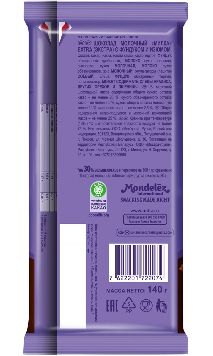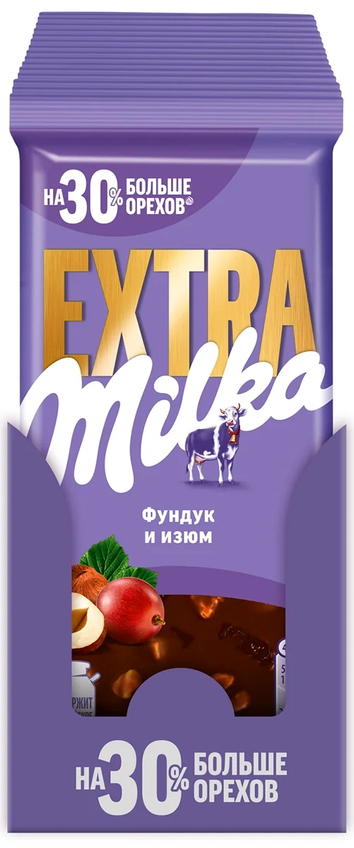 Шоколад Milka Extra молочный фундук-изюм, 140г