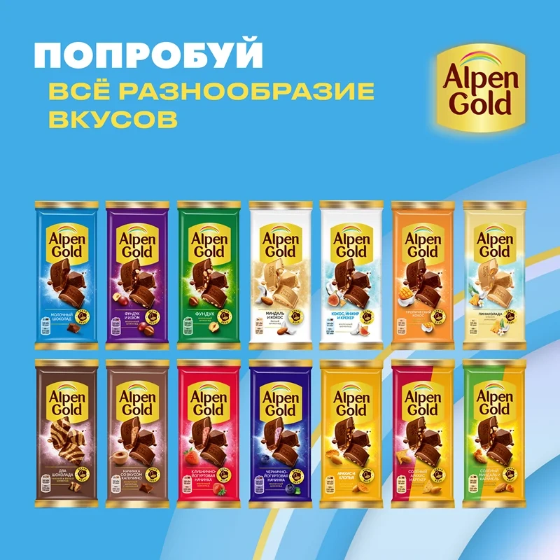 Alpen Gold уже более 25 лет радует ценителей шоколада необычными вкусовыми сочетаниями. В широком ассортименте Alpen Gold представлены как классические вкусы молочного, темного и белого шоколада, так и неординарные вкусовые миксы: каждый любитель сладкого найдет среди них что-нибудь для себя. Молочный шоколад Alpen Gold — это неизменно популярный классический вкус: нежный, буквально тающий во рту. Шоколад Alpen Gold производится по высоким стандартам качества из какао-продуктов, заряжает ярким настроением и приглашает к вкусным открытиям. Плитка шоколада Alpen Gold — это не только сладкое удовольствие в каждом кусочке, а еще и простой способ сделать свой день ярче и веселее! Благодаря компактной упаковке шоколад молочный Alpen Gold удобно брать с собой на работу, учебу, в поездку или разделить радость вкуса с самыми родными и близкими людьми! Добавь Alpen Gold в каждый момент!