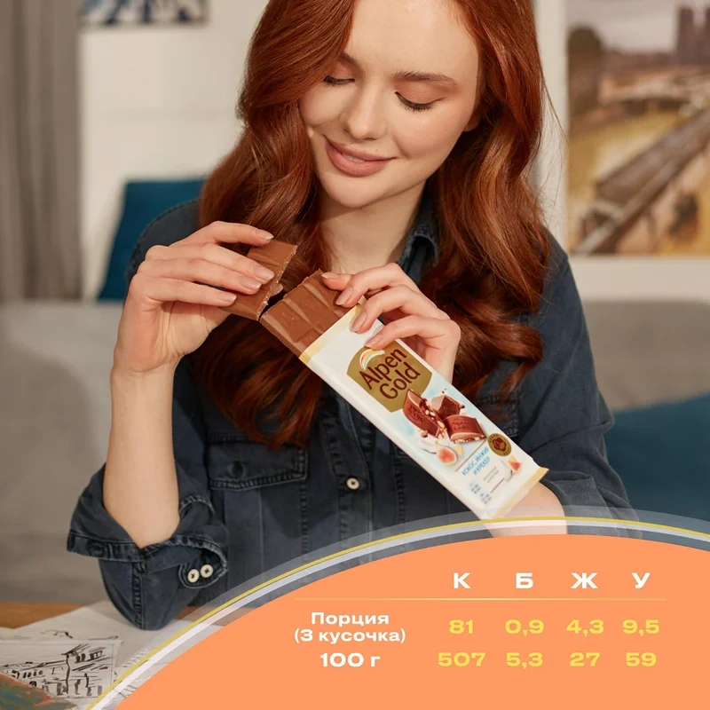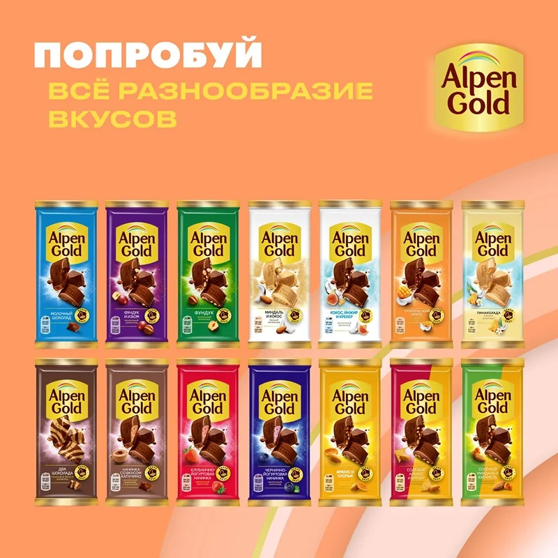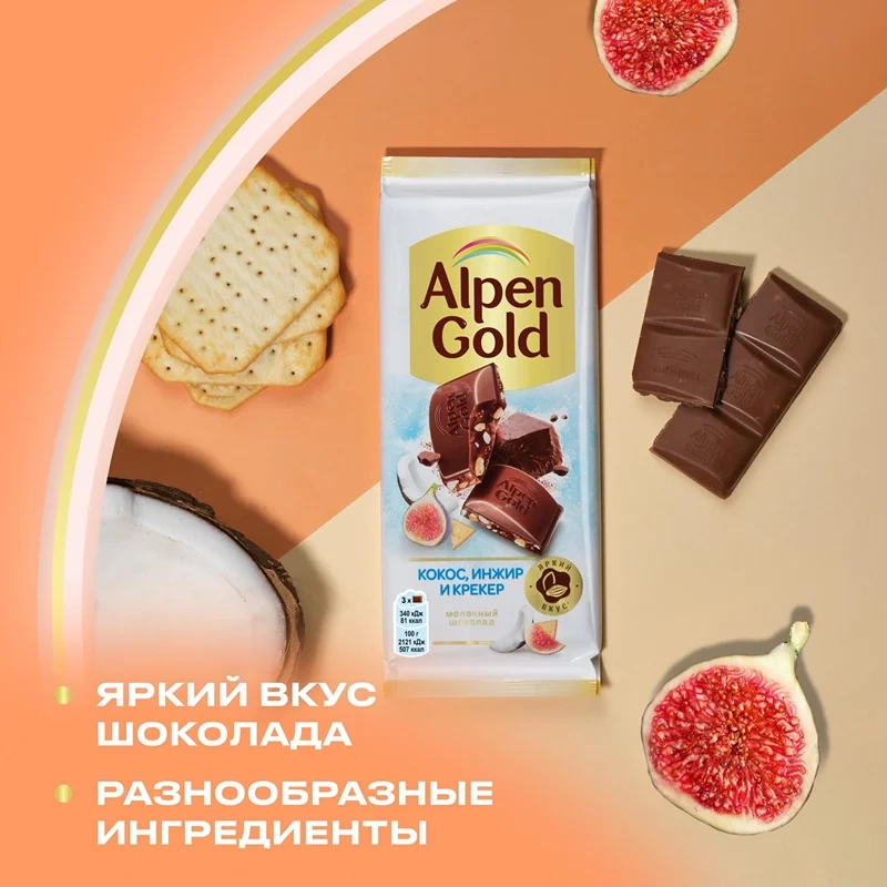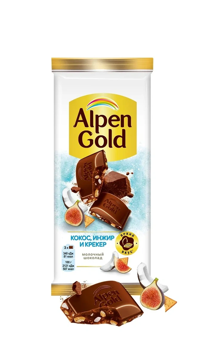 Alpen Gold уже более 25 лет радует ценителей шоколада необычными вкусовыми сочетаниями. В широком ассортименте Alpen Gold представлены как классические вкусы молочного, темного и белого шоколада, так и неординарные вкусовые миксы: каждый любитель сладкого найдет среди них что-нибудь для себя. В шоколаде Alpen Gold c сушеным инжиром, кокосовой стружкой и соленым крекером оттенки вкуса раскрываются один за другим: сладость молочного шоколада дополняется тропическим кокосом, солнечным инжиром и хрустящим соленым крекером. Шоколад Alpen Gold производится по высоким стандартам качества из какао-продуктов, заряжает ярким настроением и приглашает к вкусным открытиям. Плитка шоколада Alpen Gold — это сладкое удовольствие в каждом кусочке. А еще — простой способ сделать свой день ярче и веселее. Шоколадку Alpen Gold в компактной упаковке можно взять с собой на работу, учебу, или разделить радость вкуса в семейном кругу с самыми родными и близкими людьми! Добавь Alpen Gold в каждый момент!