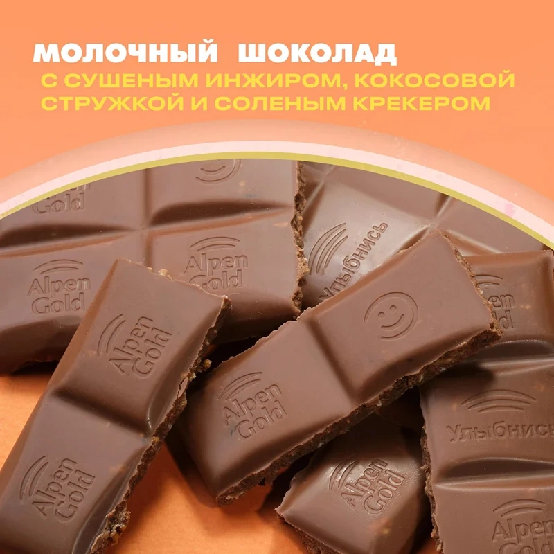Шоколад молочный Alpen Gold c сушеным инжиром, кокосовой стружкой и соленым крекером, 80г