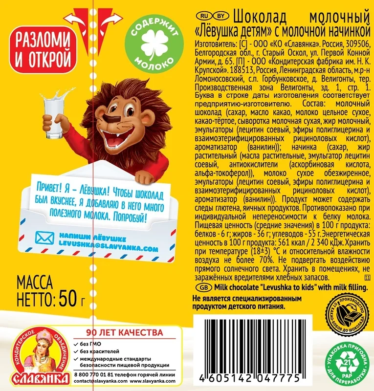 Шоколад молочный Лёвушка детям молочная начинка, 50г