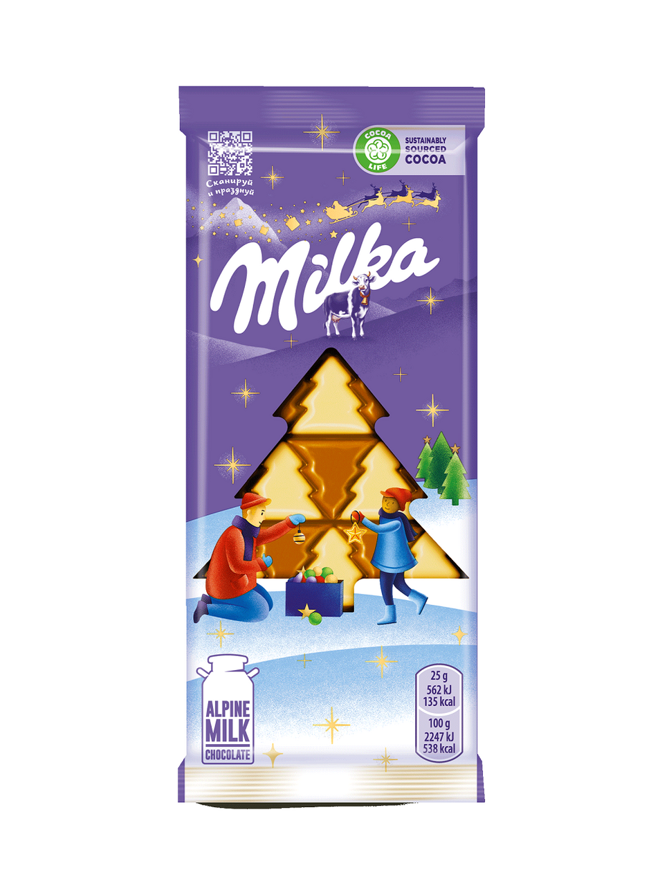 Шоколад молочный Milka с белым шоколадом в виде елочек, 100 г – это изысканное, вкуснейшее лакомство, которое безусловно понравится как детям, так и взрослым. Как и вся продукция бренда, этот десерт готовится исключительно из качественных ингредиентов. Его производство контролируется производителем, что является надежной гарантией. Кроме неповторимого вкуса стоит отметить интересное дизайнерское решение, использованное в производстве этого шоколада. Конфеты и шоколад – неотъемлемая часть подарка на Новый год. Им обрадуются взрослые и маленькие сладкоежки. К тому же конфеты – отличная альтернатива калорийным пирожным и тортам и хорошая идея для похода в гости. Хранить шоколадные изделия рекомендуется в дали от прямых солнечных лучей и в помещении с влажностью не более 75%. Так продукт не потеряет своих вкусовых и ароматических качеств. Milka – это известный бренд, под которым производится различный шоколад и конфеты. Он является частью американской компании Mondelez International Inc. Основное производство долгое время находится в Германии, в городе Лёррахе. Торговая марка впервые появилась в 1901 году в Швейцарии. Основными ингредиентами в процессе производства кондитерских изделий выступают – молоко и какао. В настоящее время широкий ассортимент включает в себя классический, пористый, белый, молочный, темный шоколад, печенья, бисквиты и многое другое. К отличительным особенностям относятся: уникальный дизайн, соответствие стандартам качества, использование современного оборудования. Символ бренда – корова фиолетового цвета с колокольчиком на шее, которая пасется на альпийских лугах.