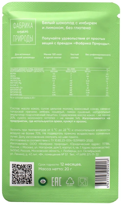 Шоколад Nature's Own Factory гречишный с имбирем и лимоном, 24 г – продукт, который отличается не только ярким, насыщенным вкусом, но и полезными свойствами для организма. В его основе лежит татарская гречиха, за счет чего лакомство обладает насыщенным и глубоким вкусом. Приятный аромат способствует пробуждению аппетита. Гречиха является одной из самых богатых белками круп. Она содержит большое количество аминокислот, среди которых есть те, что необходимы для синтеза собственных белков в организме. Также этот ингредиент богат углеводами и клетчаткой – последняя дает чувство сытости и способствует улучшению пищеварения. Гречишный шоколад идеально сочетается с горячими напитками. Он всегда является желанным дополнением к любому приему пищи. Его употребление помогает улучшить настроение (например, в хмурые ненастные дни) и уменьшить риск появления депрессии. Кроме того, такой десерт оказывает положительное влияние на деятельность мозга. Продукт выпускается в плотной упаковке с лаконичным дизайном. Хранить его следует при температуре +18 +/3 градуса при относительной влажности воздуха до 75%. Также важно не подвергать лакомство воздействию прямых лучей солнца. Торговая марка Nature's Own Factory была основана двумя лучшими подругами в 2017 году. Основное задачей стало наладить процесс производства натуральных продуктов с уникальным вкусом. Первым в ассортименте фирмы стал гречишный чай. Руководители долго искали настоящий чай высокого качества, который спустя полгода поисков была найден на единственной фабрике на Тайване. Постепенно линейка реализуемой продукции существенно расширилась. Сегодня она включает около 20 продуктов. Также компания предлагает на выбор разные варианты подарочных наборов.