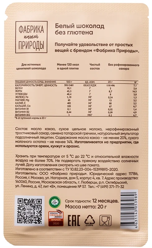 Шоколад Nature's Own Factory гречишный белый, 24 г – продукт, который отличается не только ярким, насыщенным вкусом, но и полезными свойствами для организма. В его основе лежит татарская гречиха, за счет чего лакомство обладает насыщенным и глубоким вкусом. Приятный аромат способствует пробуждению аппетита. Гречиха является одной из самых богатых белками круп. Она содержит большое количество аминокислот, среди которых есть те, что необходимы для синтеза собственных белков в организме. Также этот ингредиент богат углеводами и клетчаткой – последняя дает чувство сытости и способствует улучшению пищеварения. Гречишный шоколад идеально сочетается с горячими напитками. Он всегда является желанным дополнением к любому приему пищи. Его употребление помогает улучшить настроение (например, в хмурые ненастные дни) и уменьшить риск появления депрессии. Кроме того, такой десерт оказывает положительное влияние на деятельность мозга. Продукт выпускается в плотной упаковке с лаконичным дизайном. Хранить его следует при температуре +18 +/3 градуса при относительной влажности воздуха до 75%. Также важно не подвергать лакомство воздействию прямых лучей солнца. Торговая марка Nature's Own Factory была основана двумя лучшими подругами в 2017 году. Основное задачей стало наладить процесс производства натуральных продуктов с уникальным вкусом. Первым в ассортименте фирмы стал гречишный чай. Руководители долго искали настоящий чай высокого качества, который спустя полгода поисков была найден на единственной фабрике на Тайване. Постепенно линейка реализуемой продукции существенно расширилась. Сегодня она включает около 20 продуктов. Также компания предлагает на выбор разные варианты подарочных наборов.