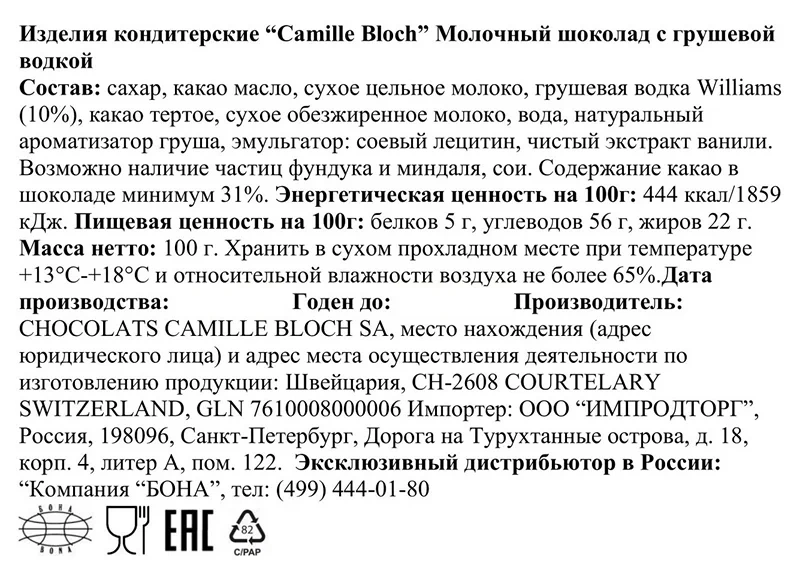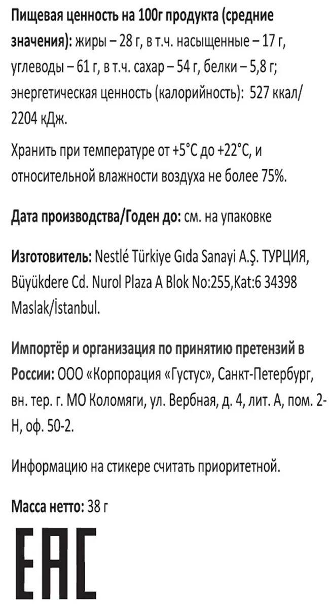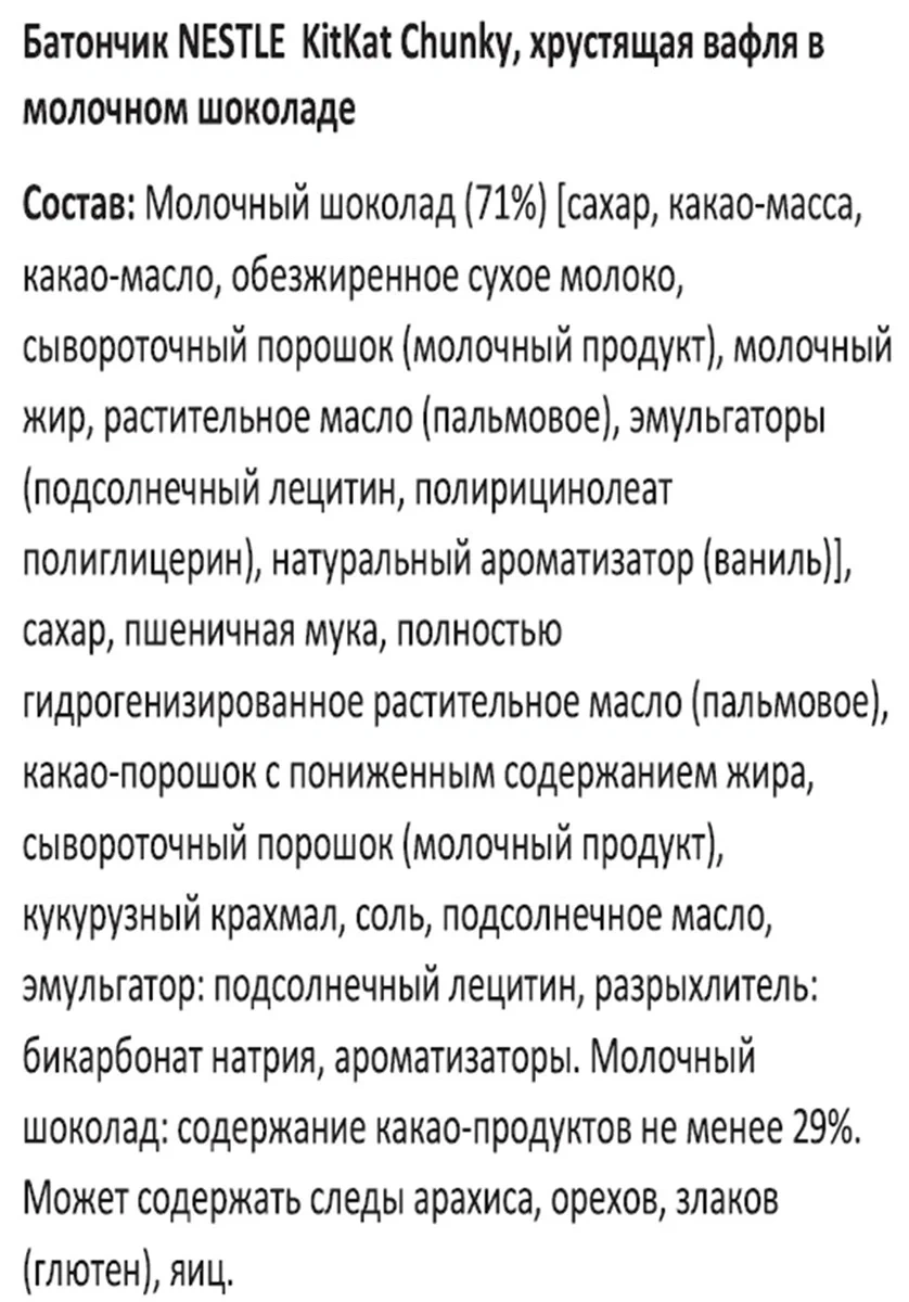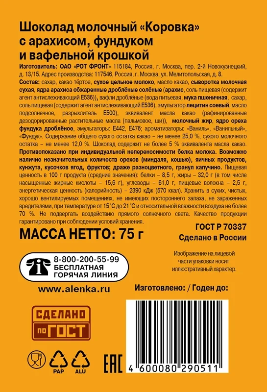 Сахар, фундук (28%), сухое цельное молоко, масло какао, тертое какао, эмульгатор: лецитин соевый.