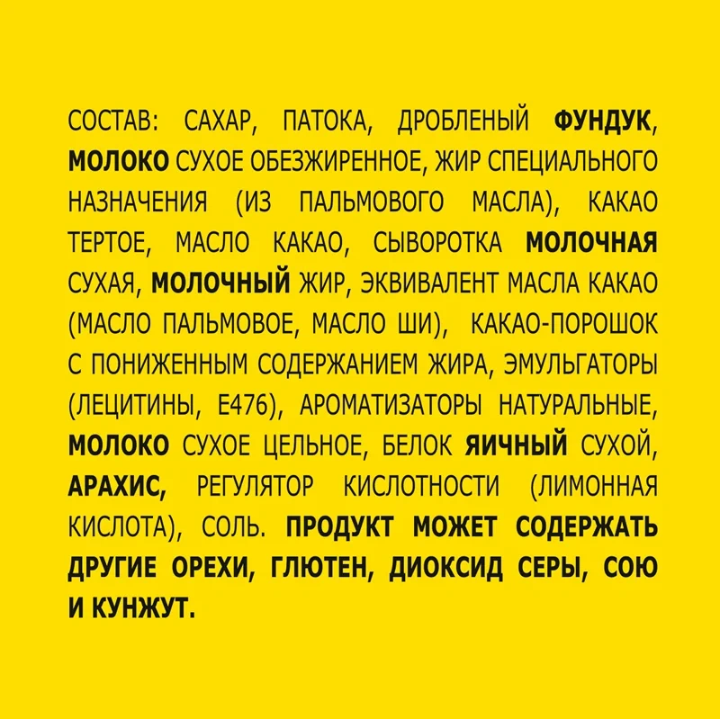 Сахар, патока, дробленый фундук, сухое обезжиренное молоко, жир специального назначения (из пальмового масла), какао тертое, масло какао, сухая молочная сыворотка, молочный жир, эквивалент масла какао (масло пальмовое, масло ши), какао-порошок с пониженным содержанием жира, эмульгаторы (лецитины, Е476), натуральные ароматизаторы, сухое цельное молоко, яичный белок сухой, арахис, регулятор кислотности (лимонная кислота), соль.