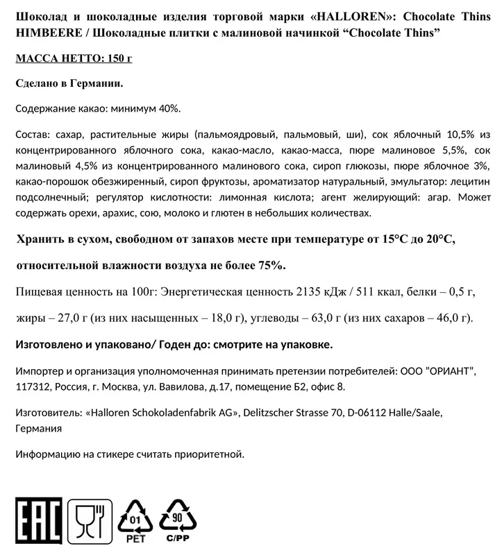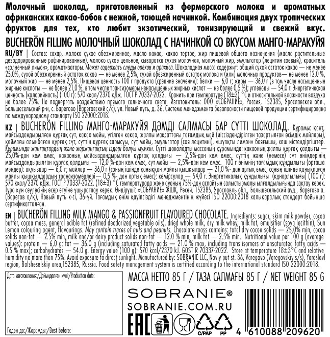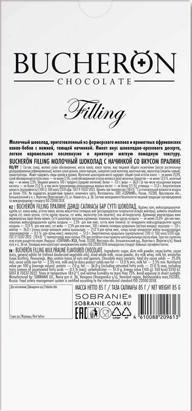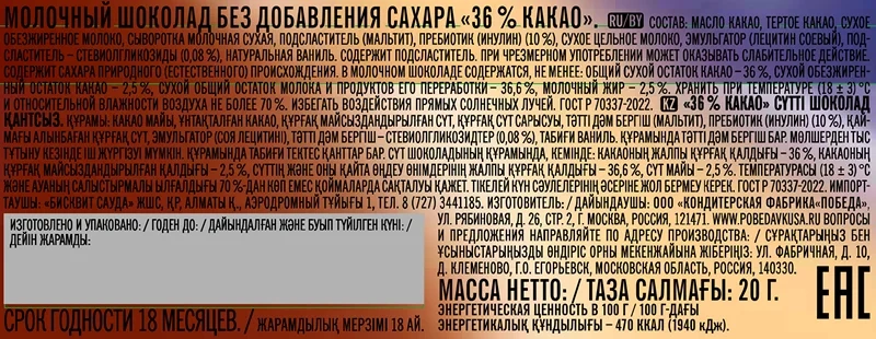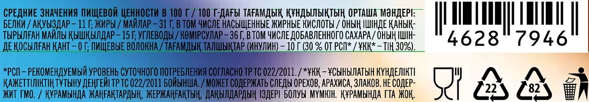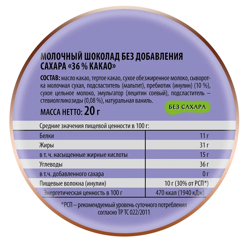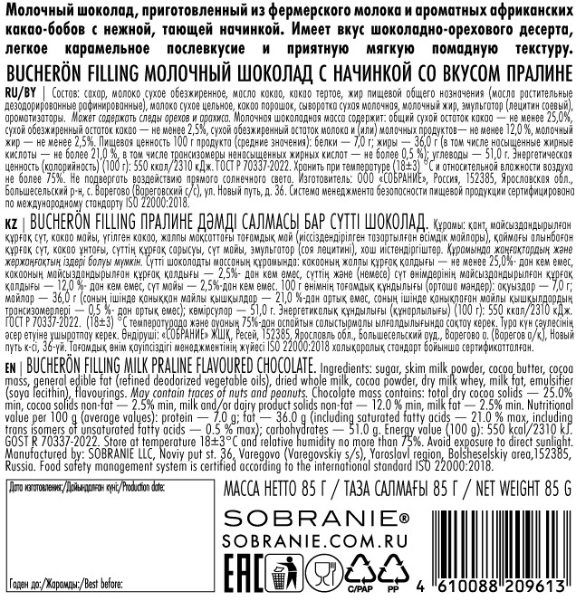 Молочная начинка (52%) (обезжиренное сухое молоко (37,4%), растительное масло (подсолнечное), сахар, эмульгатор (подсолнечный лецитин), ароматизатор натуральный ванилин); молочный шоколад (40,5%) (сахар, какао-масло, обезжиренное сухое молоко, масса какао, сухая молочная сыворотка, молочный жир, какао-порошок, эмульгатор, ароматизатор натуральный ванилин); злаки (7,5%) (пшеница, рис, гречиха).