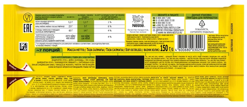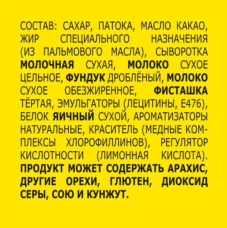 Белый шоколад: сахар, какао-масло, цельное сухое молоко, молочная сухая сыворотка, сухое обезжиренное молоко, эмульгатор фосфатиды аммония, полиглицерол полирицинолеат, ароматизатор ванилин, фисташковый крем: фисташка, сахар, растительное масло (подсолнечное, хлопковое, пальмовое), цельное сухое молоко, молочная сухая сыворотка, эмульгатор лецитин подсолнечника, антиоксидант токоферол, ванильный ароматизатор; турецкая сладкая вата: пшеничная мука, сахар, растительное масло (пальмовое, подсолнечное, хлопковое), ароматизатор ванилин, порошок сушеной малины.
