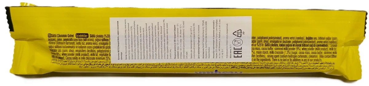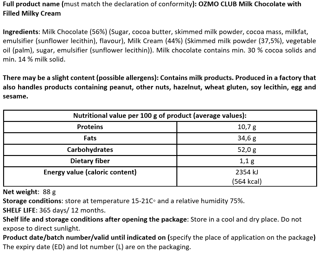 Сахар, лесные орехи (из которых 11% целые), какао тертое, кокосовый жир, сухое цельное молоко, какао порошок, соевая мука, какао масло, топленое масло, эмульгатор: рапсовый лецитин, экстракт ванили.