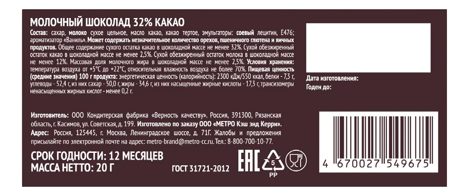 | Вид шоколада | молочный |