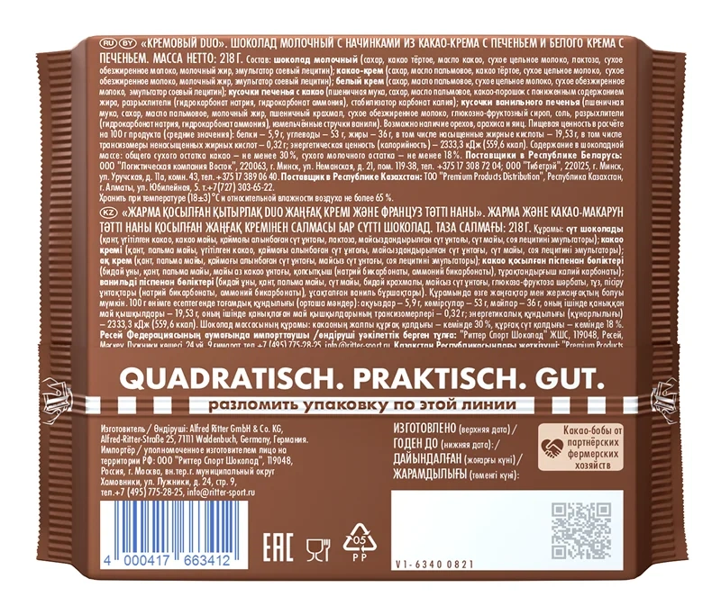 Шоколад Ritter Sport Duo молочный кремовый, 218г