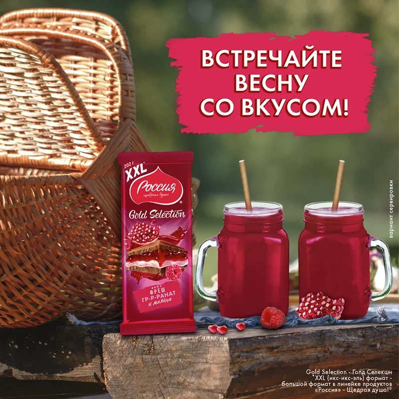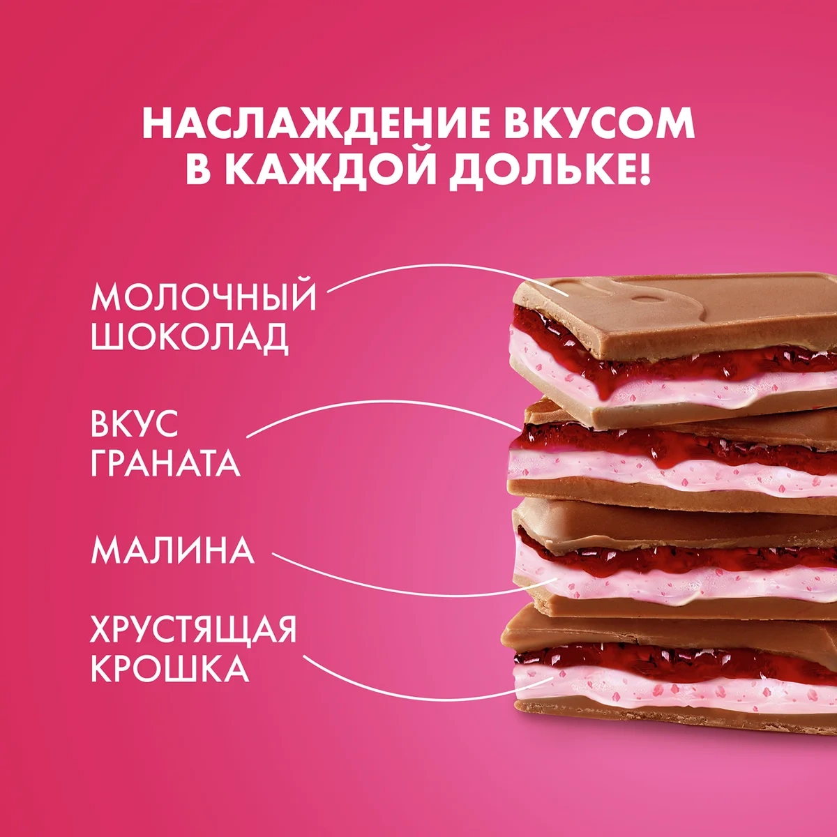 Молочный шоколад Россия - Щедрая душа! Голд селекшен со вкусом Фреш Гранат и Малина - это весенняя свежесть в каждой дольке. Нежный молочный шоколад раскрывает сочную двухслойную начинку с освежающим вкусом граната, малиновыми нотками и хрустящей крошкой. Каждая встреча с близкими наполнена теплом, а шоколад добавит особый вкус вашим мгновениям уединения и станет вкусной компанией.