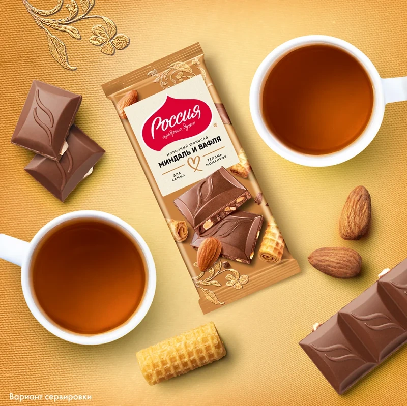 Сложно пройти мимо невероятно популярного сочетания отборного обжаренного миндаля и хрустящей вафли в шоколаде Россия-Щедрая душа. Молочный шоколад с миндалём и вафлей. Простое, но невероятно вкусное сочетание нежного молочного вкуса, отборных качественных ингредиентов и аппетитной форма шоколада - обещают сладкое гастрономическое удовольствие, а современный яркий дизайн упаковки порадует ваш взгляд.