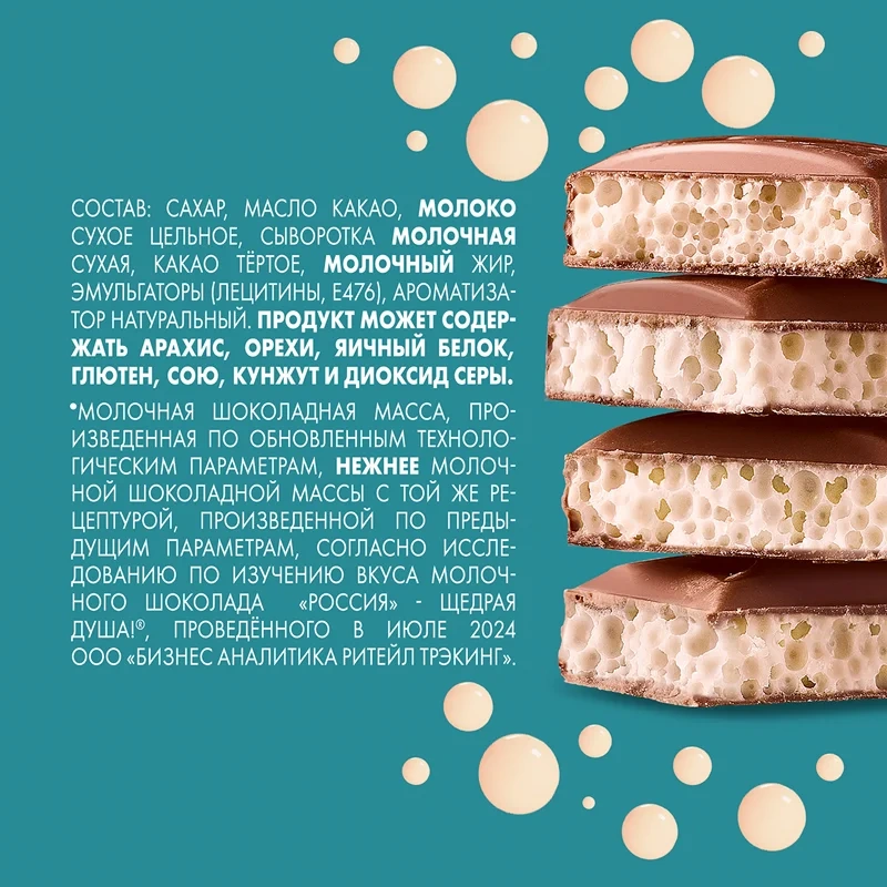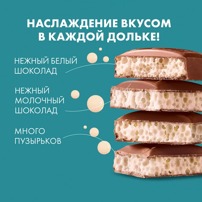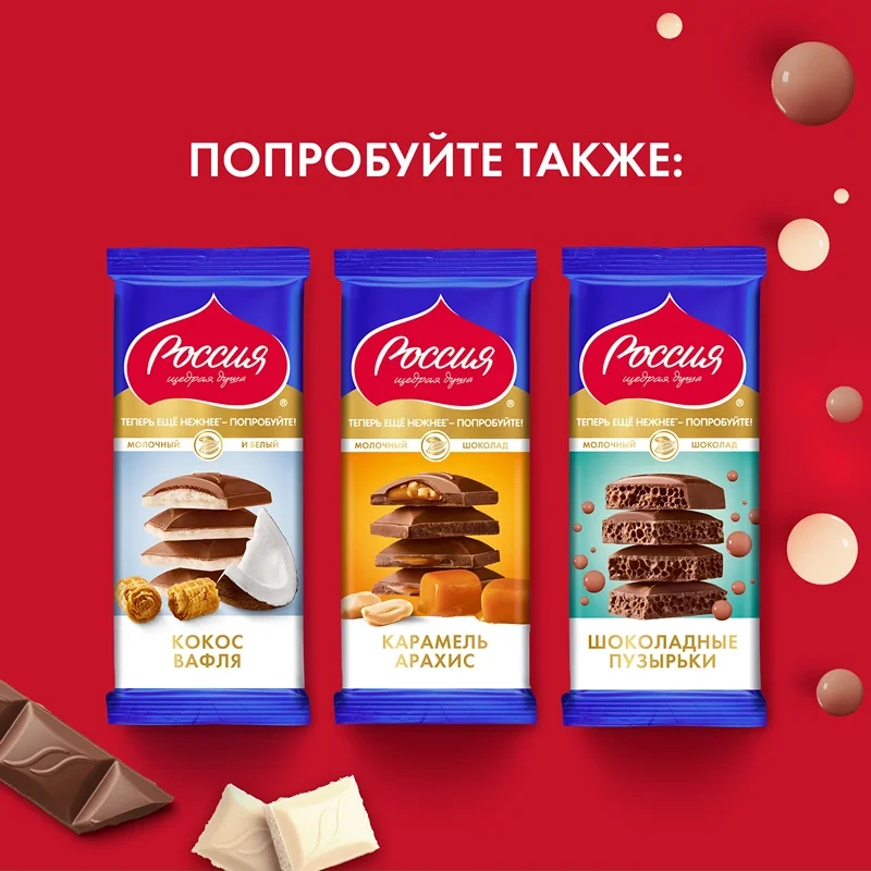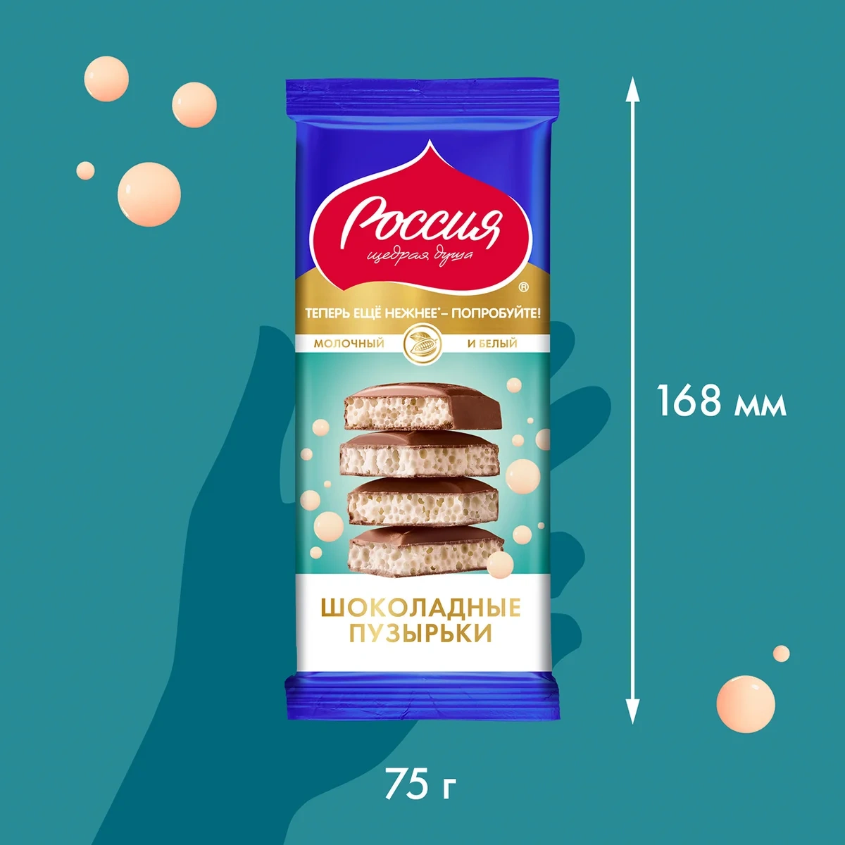 Шоколад Россия Щедрая душа молочный шоколад, белый шоколад, 75г – качественный шоколад с воздушными пузырьками нежного молочного и изысканного белого шоколада и притягательным вкусом ванили. Тающий вкус пористого молочного шоколада и нежных воздушных пузырьков в одной плитке.