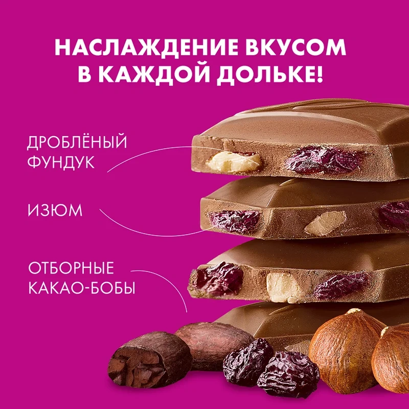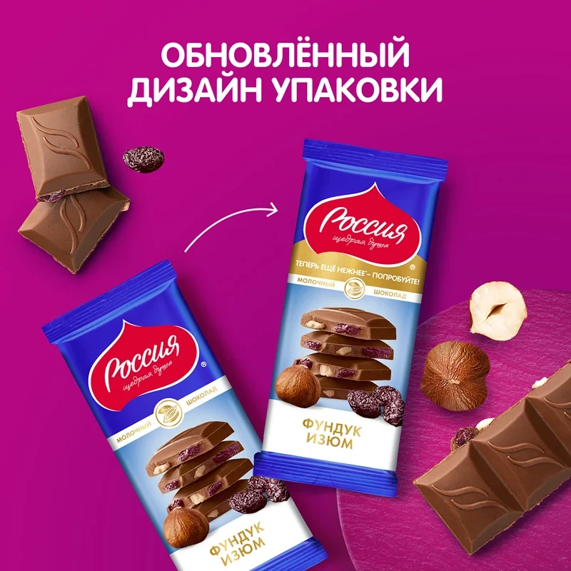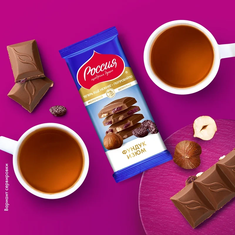 Сложно пройти мимо невероятно популярного сочетания отборного обжаренного фундука и сочного изюма в шоколаде Россия-Щедрая душа! Молочный шоколад с фундуком изюмом. Простое, но невероятно вкусное сочетание бархатистого молочного шоколада, отборных качественных ингредиентов и аппетитной форма шоколада - обещают сладкое гастрономическое удовольствие, а современный яркий дизайн упаковки порадует ваш взгляд.