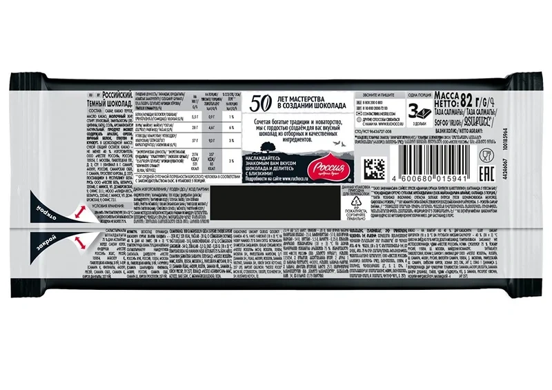 Шоколад Россия Щедрая душа Российский темный, 82г - это классика темного шоколада с высоким содержание какао-продуктов. Благородный терпкий вкус с насыщенными нотками рома и притягательным вкусом какао - не оставят в стороне ценителей настоящего темного шоколада. Насладиться оригинальным вкусом можно с чашечкой черного кофе, ведь именно этот напиток лучше всего подчеркивает нотки темного шоколада.