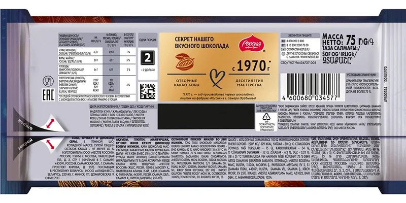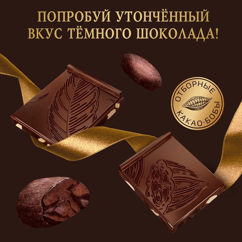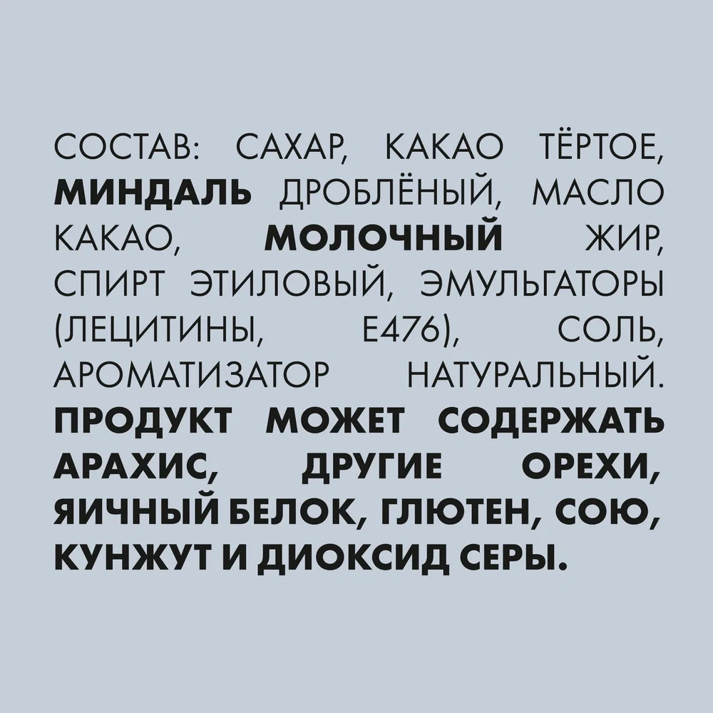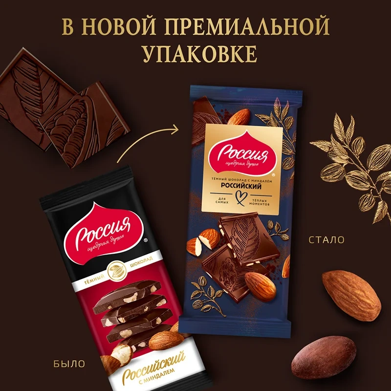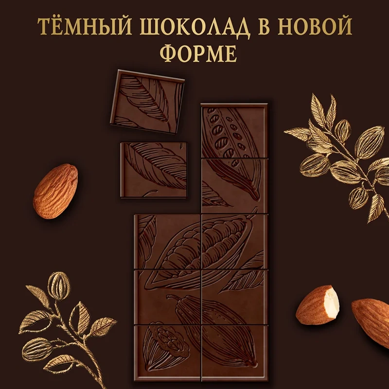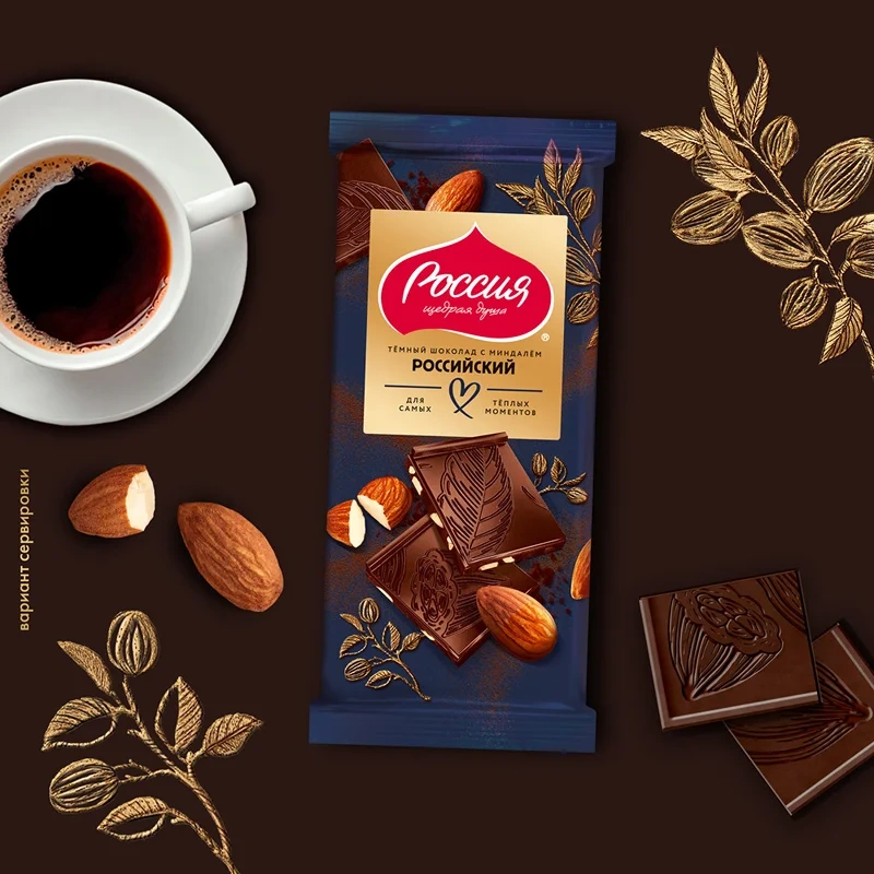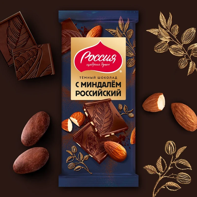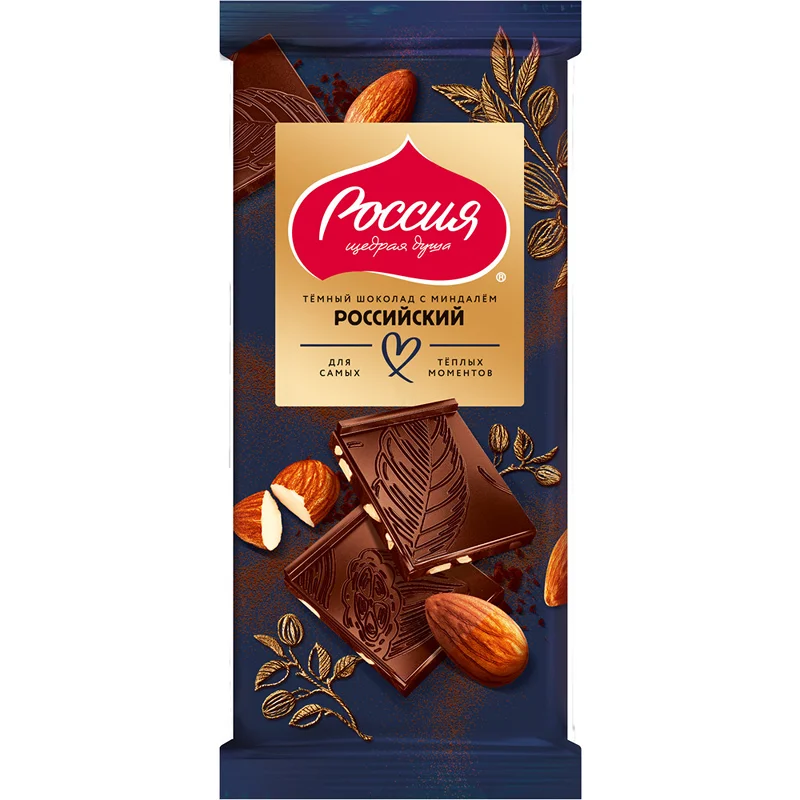 Храня верность традициям, мы создаём качественный шоколад по оригинальным рецептам. Шоколад Россия-щедрая душа! Российский Темный шоколад с миндалем - это классика темного шоколада с высоким содержание какао-продуктов и ароматным миндалем. Благородный терпкий вкус с насыщенными нотками какао и россыпью обжаренного миндаля - не оставят в стороне ценителей настоящего темного шоколада.