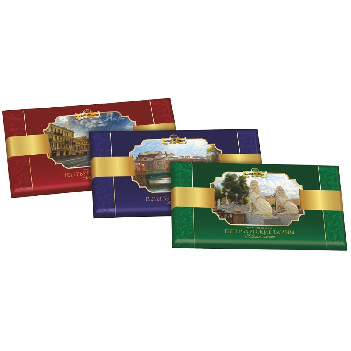 Молочный шоколад, изготовленный по ГОСТ 31721. В дизайне использованы изображения трех известных и загадочных мест Петербурга: Невский проспект, Львиный мостик, Поцелуев мост. На оборотной стороне этикета размещена история достопримечательности.