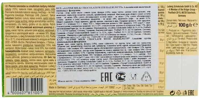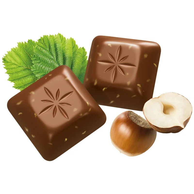Приготовлен из отборных какао-бобов (массовая доля какао составляет не менее 30%) и расколотых на мелкие кусочки хрустящих лесных орехов. Уникальность этого шоколада не только в его рецептуре, но и в форме. В упаковке вы не найдете цельной плитки: она уже поделена на аккуратные квадратные ломтики с фирменным оттиском, разложенные на плотной картонной подложке. Такие кусочки удобно не только есть, но и подавать к чайному столу - их можно выложить в вазочку как оригинальные шоколадные конфеты.
