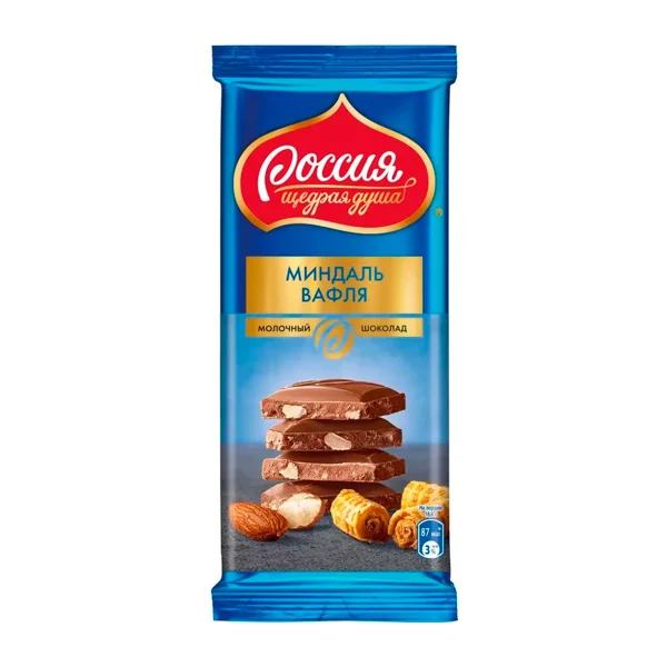 Сложно пройти мимо невероятно популярного сочетания отборного обжаренного миндаля и хрустящей вафли в шоколаде Россия Щедрая душа. Молочный шоколад с миндалём и вафлей. Простое, но невероятно вкусное сочетание нежного молочного вкуса, отборных качественных ингредиентов и аппетитной формы шоколада - обещают сладкое гастрономическое удовольствие, а современный яркий дизайн упаковки порадует ваш взгляд.