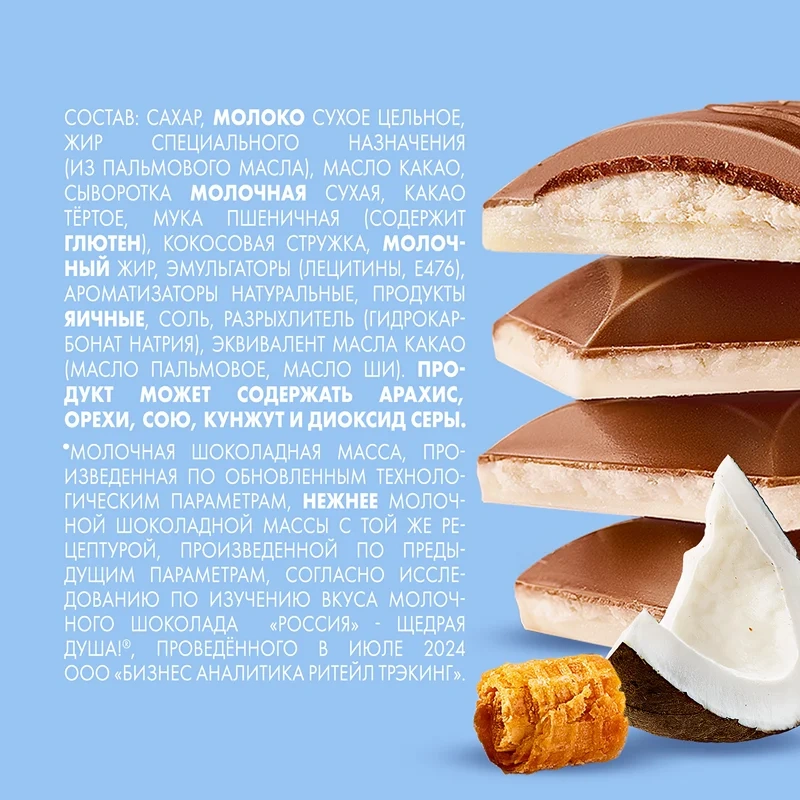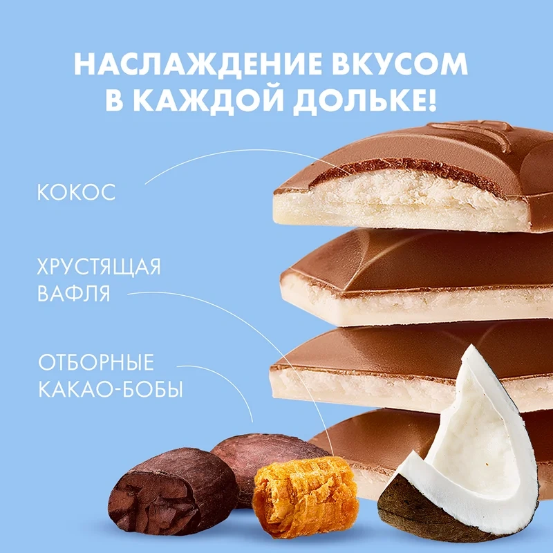 Оригинальное сочетание белого и молочного шоколада, нежной кокосовой начинки, кокосовой стружки и хрустящей вафли.