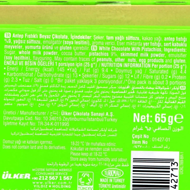 Шоколад Ulker белый с фисташками, 65г x 6 шт