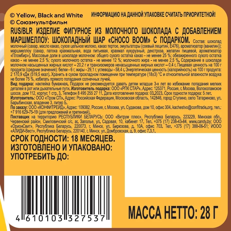 Шар шоколадный Choco Boom Чебурашка с маршмеллоу, 28г