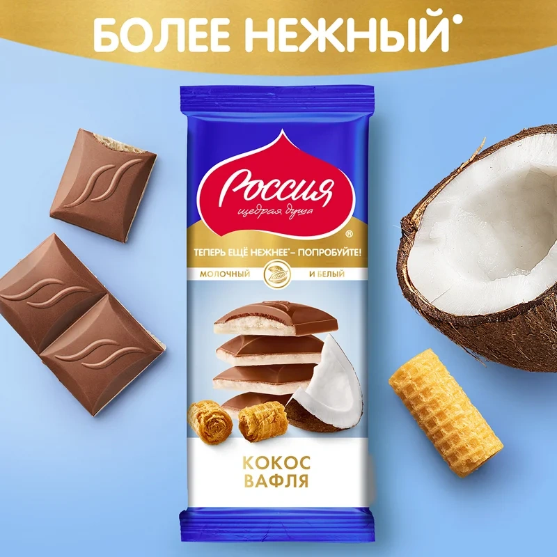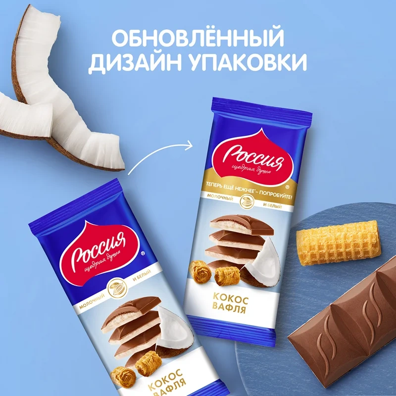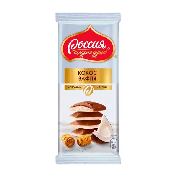 Шоколад Россия Щедрая Душа молочный и белый с кокосом, 82г