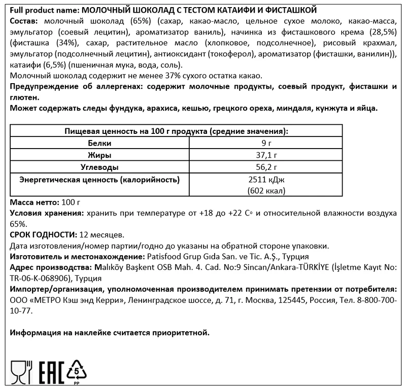 Шоколад Patislove молочный тесто катаифи-фисташка, 60г