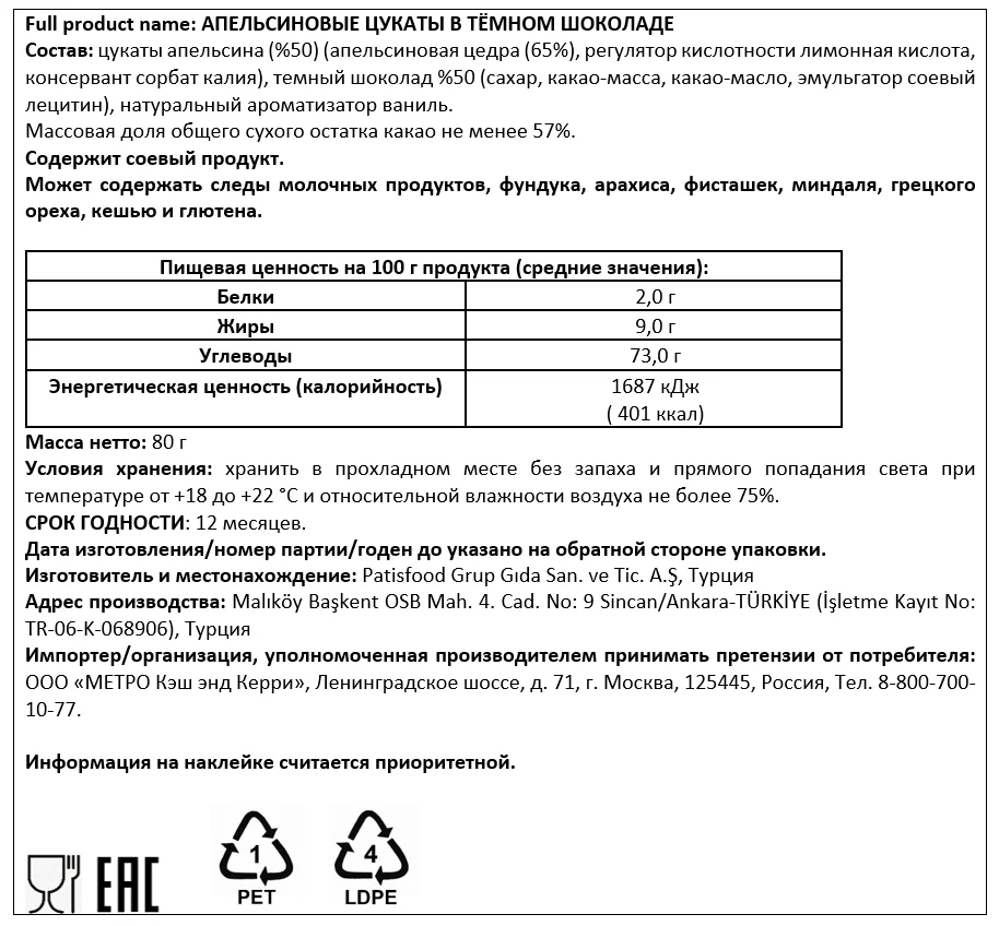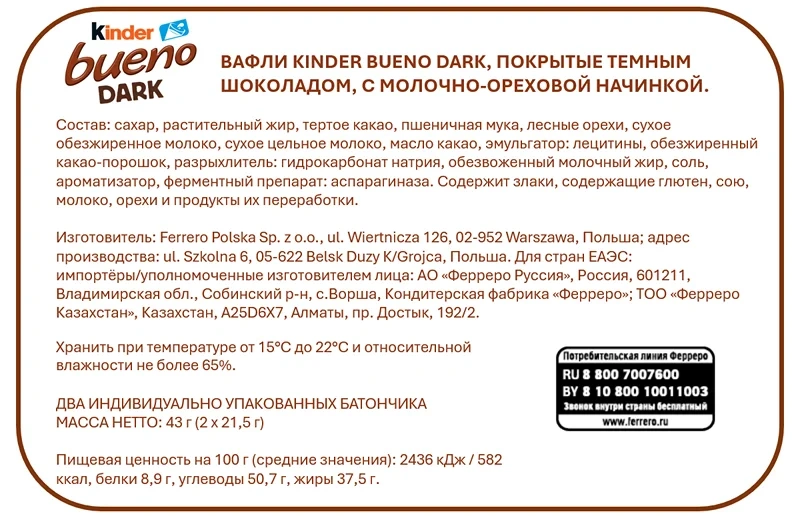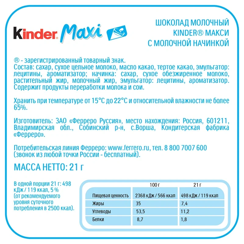 Сахар, молоко, какао-масло, фундук 11%, какао масса, сухое цельное молоко, сухая пахта, пшеничная мука, кукурузный крахмал, эмульгатор соевый лецитин, подсолнечное масло, соль, ароматизаторы.