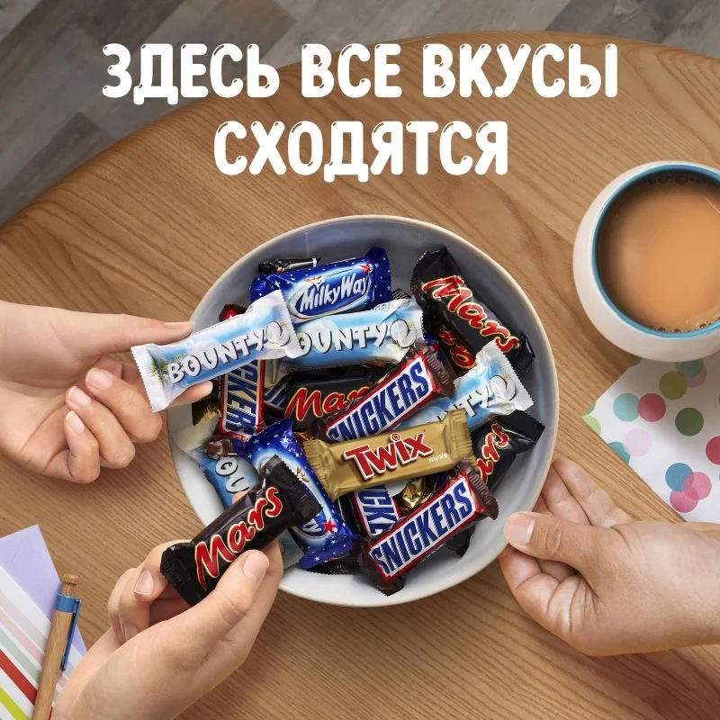 Шоколадные мини батончики Snickers прекрасно впишутся как в офисное пространство, так и домашнее. Чаепитие с любимыми конфетами поможет восстановить силы и повысит умственную активность, способствуя лучшей концентрации внимания. Во время сложных физических и интеллектуальных нагрузок сладкое лакомство будет как никогда кстати, создавая приятную атмосферу и добавляя решимости и уверенности в своих силах. К тому же это замечательный повод собраться с друзьями за чашкой чая или кофе и обсудить успехи и поделиться важными моментами.