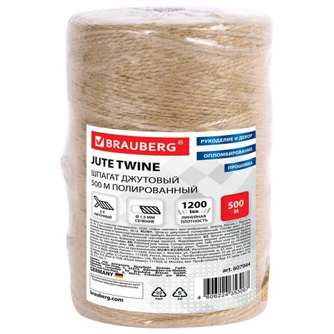 Длина шпагата - 500 м, диаметр нити - 1,5 мм, линейная плотность 1200 текс.