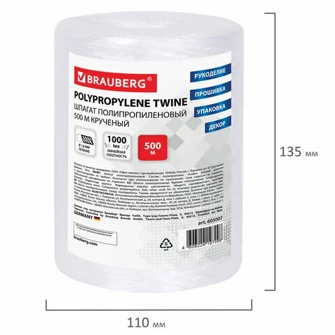 Шпагат Brauberg 1ктекс, 1.6мм х 500м, полипропиленовый