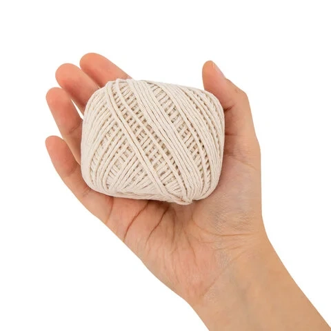 Изготовлен из хлопкового волокна методом скручивания нескольких волокон. Обладает высокой прочностью. Хлопковый шпагат мягкий, легко вяжется в узлы, устойчив к разрывам и растяжениям.